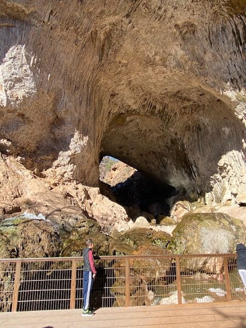We stopped in Payson and visited the visitor center, where the nice lady gave us all sorts of information and a great lunch recommendation. We had lunch at the Delicious Café in Payson and it was indeed quite delicious! From there, we drove to Pine and stopped off at the Tonto Natural Bridge State Park ($7 per adult and $4 per kid). The Anna Mae and Pine Creek trails were closed due to ice, but we were able to hike the Gowan trail down below the bridge and also to the viewpoint above it.