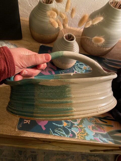 You guys know that I love a beautiful handmade pottery piece and I couldn’t resist this one and was determined to fit it into our suitcase to come back home. It is pretty large — about plate sized — and beautifully done. I currently have it next to my reading spot in the den to corral miscellaneous stuff.