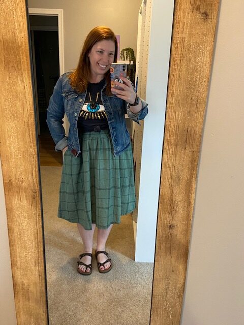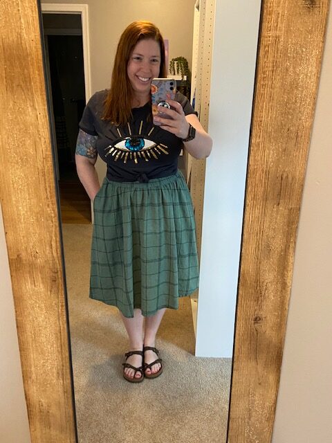 I bought it in 2022 because I liked the cinched waistband, the pockets and the lightweight linen fabric. However, I’m not really a *light colored* skirt kind of girl, so it wasn’t getting worn very often.
