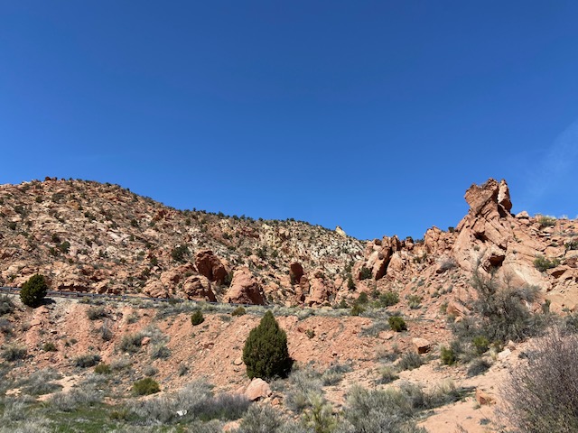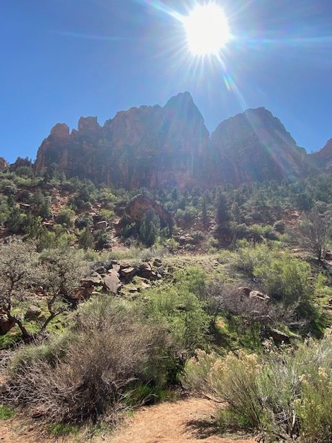 We spent the day zooming around on our e-bikes and stopped at the Zion Lodge to lock them up and eat our packed lunch. From there, we walked over to the Emerald Pools Trailhead for a hike to a waterfall and back. Once again, the hike was rather crowded so if you like a little less people when you’re exploring, you might want to stick to just e-biking around. By the end of the day, Travis’ allergies were killing him and we were all exhausted from biking and hiking so we headed home.