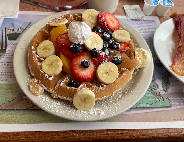 Every time we go to Williamsburg, one of my favorite places is the Astronomical Pancake House. So, even though the rest of the family decided to get up early and go to breakfast at 9, I knew Jack was going to want to sleep in (he was up past 10pm with our shenanigans). Sure enough, he rolled out of bed at 9:30 with plenty of time for us to pack up our room, check out and drive on over for pancakes. Actually, I should say waffles… because THIS: