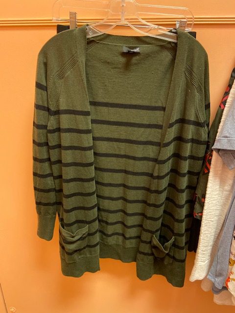 This is the kind of sweater that I thrift, wear the bejesus out of until it’s misshapen and pilled, and then donate and the cycle starts all over again. This one is a pretty moss green with black stripes and I’ve already worn it to work once over a black t-shirt and jeans. At less than $6, this was perfectly priced for something that will get plenty of wear.