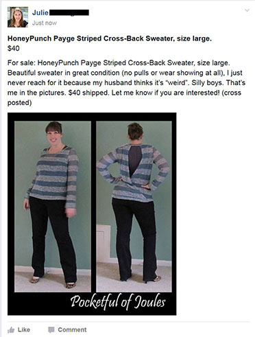 Love this! I’ve sold (and purchased!) all sorts of things off Facebook, but mostly in “garage sale” groups that are local to my town, where we meet in a public location and pay in cash. Checking out the Stitch Fix groups now!
