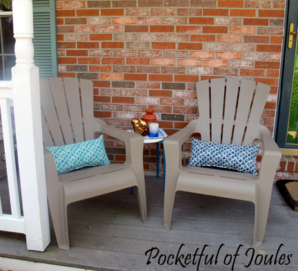 When we first moved in, I decorated our front porch with a couple painted chairs. I actually found the chairs in our garage (left over from the last homeowners) and spray painted them yellow. They were okay for a while, until I decided that the yellow wasn’t doing it for me and I repainted them navy blue.