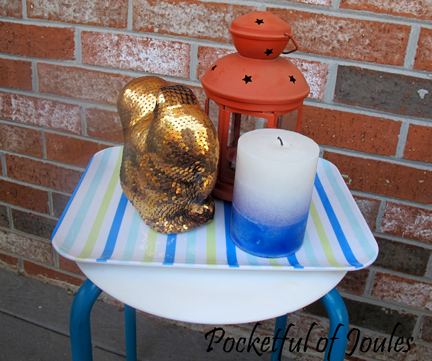 The little stool/table is the one that I spray painted a couple years ago (originally from Ikea’s clearance section for $3). My sassy sparkle squirrel is from West Elm, the tray is from a Totswap and the candle was rescued from another room. The lantern is also from Ikea, by way of a thrift store.