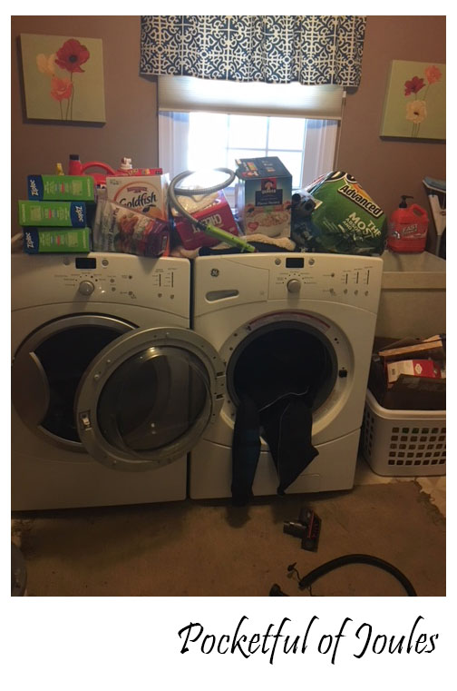 I put a table across from the laundry machines as a way to have some nice hidden storage, but it wasn’t cutting it. I forgot to take a photo of the actual table, but here is our stash piled on top the washer/dryer after I removed it: