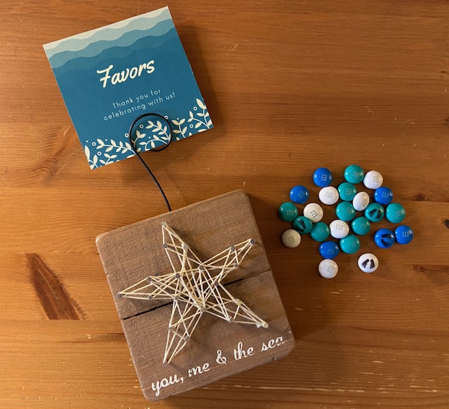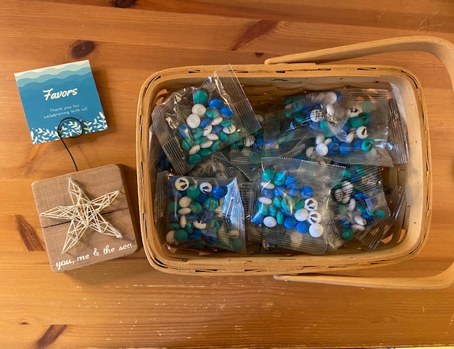 We did an ‘Under the Sea” theme, so I decided to go with personalized M&M packs in blue, blue-green and white to celebrate their little boy. I had the candies personalized with Welcome {baby name} and also some had little baby footprints on them. They ended up costing about $2.50 per pack and I found a random promo code online that gave me about $11 off the total order.