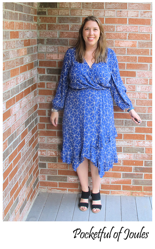 And no. It’s TERRIBLE on me. The wrap top is okay and keeps everything covered, but there is so much fabric that it just kind of bags around. The sleeves are quite blousy and even when pushed to be ¾ length. The worst part is the skirt. The ruffles give it a weird hemline and even though the ladies on the reviews said it was so pretty and flattering… well, it’s not. It’s just totally awful on me and doesn’t flatter my figure at all.