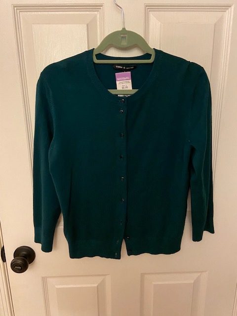 I wear these cardigans all the time to work, and I don’t own this color. It’s hard to tell in the first photo, but it’s a pretty dark greenish-blue. So, for $6 it was a no-brainer to add it to my closet. I actually think I did own this color once and it got too worn and pilled (even with my fabric shaver). Anyway, this one will certainly get some wear.