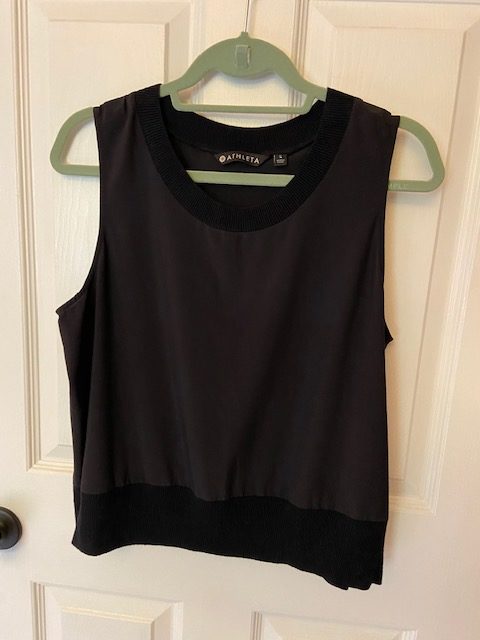 When I think of Athelta, I think of exercise clothes. However, after finding my favorite new pleated skirt from the brand it has opened my eyes to their fantastic workwear! I found this Athelta tank top at a consignment store and it is super cool – the neckline and bottom have a cotton band finish but the center is very silky. It’s tone-on-tone black and I like the fun details. I did some research and it’s called the Athleta Zephyr Shell tank top and came in a few different colors and one print. It is part of their ‘travel’ collection, as it has SPF 50, washes and dries quickly, and doesn’t wrinkle.