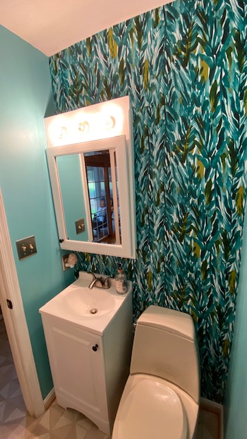 In January, we ended up tearing out the pedestal sink that took up a ton of space with NO storage, and replacing it with a small 18” vanity. I also painted the existing wood mirror/light combo white to match the new sink base and called it a day.