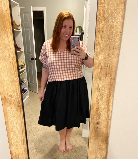 I loved everything about it. The linen was lightweight, but not transparent. The boxy shape was cute with a high-waisted skirt. The rolled sleeves were super flattering. I even liked the faint pink background and the brown gingham pattern. Oh, and $20. LOVE IT.