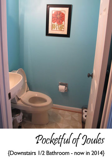 Throwing some paint on the wall is pretty much all we did for this bathroom. The flower picture came from Homegoods a few years ago and was in a bathroom in our last house too. The basket that we use for storing extra TP came as part of a gift set at some point in the last 10 years. I swear, I think I have dozens of baskets hidden away in this house and I probably only paid for 1/3 of them. I think I might be a basket hoarder.