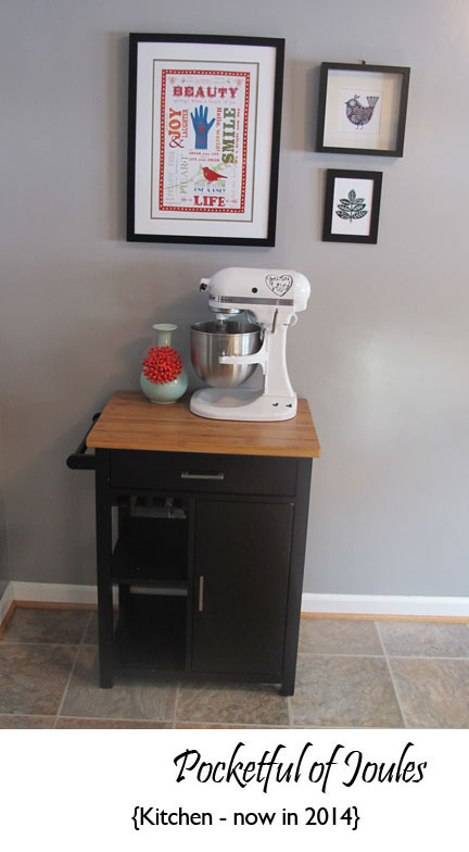 The kitchen cart is from Target for $149.99, I just didn’t add on the wheels. If you like it, the red version is currently on sale for $74.98. The white KitchenAid mixer was handed down from my sister-in-law – I added the “made with love” decals to it myself. The vase was something that I would gaze lovingly at every time I went to Anthropologie until I received it as a gift for my birthday a couple years ago. The wall art is from Homegoods (large picture) and Ikea (small pictures). So you see, EVERYTHING was done on a budget!