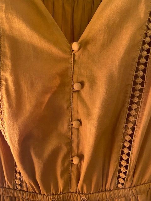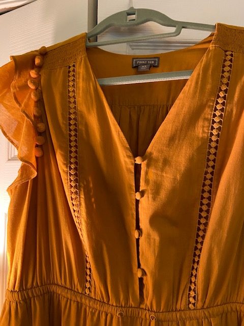Here is the “after” of the dress. It now is sewn up completely, making the buttons just decorative. However, the dress easily slips on and off over your head, so now it is nice and smooth with no peekaboo issues.