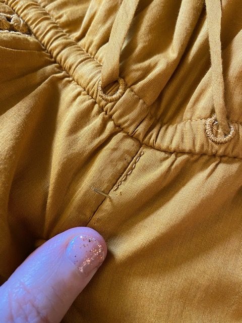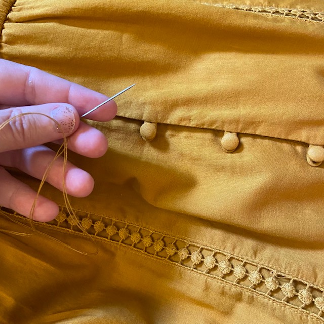 Easy fix: grab a needle and some matching thread! You just have to hold the dress together so that the seams are straight. I used an easy embroidery backstitch to sew it up. I did it completely by hand and while the stitching isn’t perfect, it does the job and the thread blends right in.
