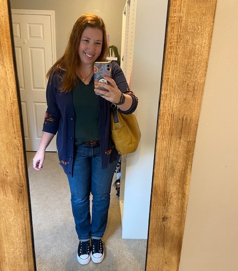 So, I grabbed a bottle of Rit dark green dye, spent about 40 minutes swishing the cardigan around, and BOOM it’s exactly what I was hoping for. A beautiful shade of green that I will actually wear: