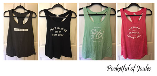 After placing my order, I never received any tracking information… and literally the day I checked in with them on Facebook my package arrived to my mailbox. My Mystery Bag contained four tank tops in four different colors: Hot Mess Mom, Don’t Make Me Use My Mom Voice, Fix Your Messy Bun and Get it Done, and Happier than a Seagull with a French Fry. Both the Hot Mess Mom and Seagull tops are currently on their website on sale for $14.95 and the Mom Voice tank is on sale for $24.95. So, $25 for all for was a pretty good deal.