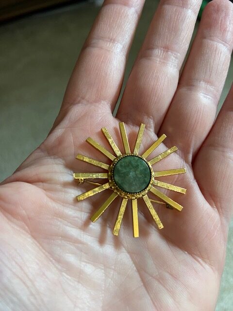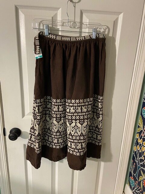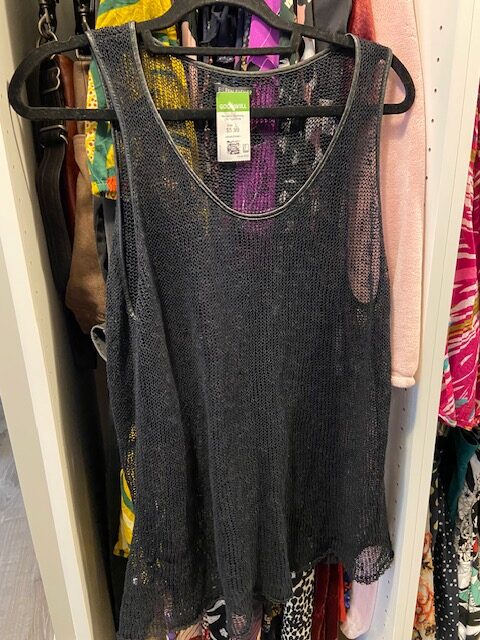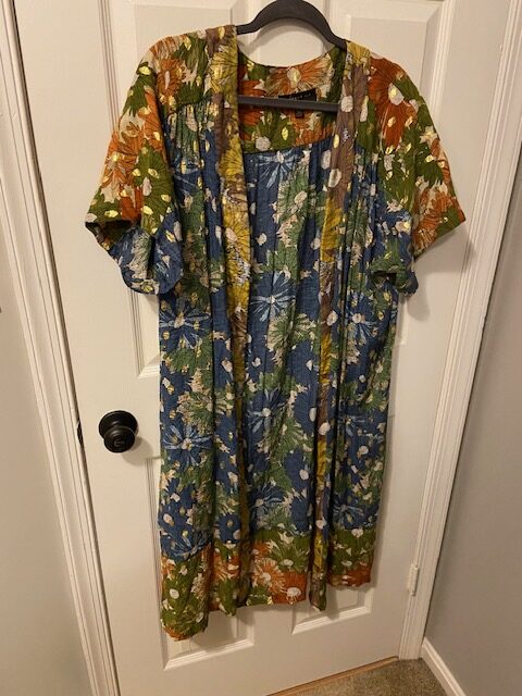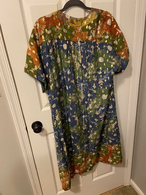 This fun duster/kimono-type thing called to me from across the aisle. It was stuffed in with the size small dresses, but I was intrigued by the metallic gold accents. Rather than being a size small dress, it’s actually a “one size” duster from Anthropologie (retail $120)!