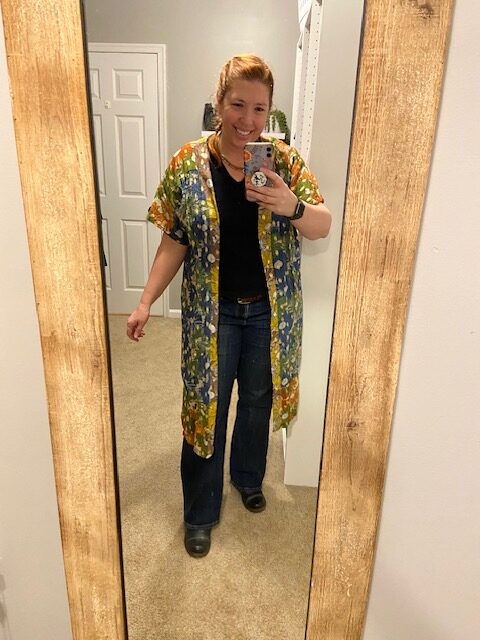 I tried it on over my tee shirt and jeans and kind of love it, so I figured it should come home with me. I like it as a duster with the outfit I was wearing, but I also think this will look cute over shorts and a tank top in the summer, or even as a swimsuit coverup.