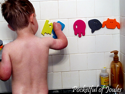It’s unlike any of the bath toys we currently have, so I thought that Jack might get a kick out of it. He had an awesome time sticking each applique up on the wall and then throwing them all back down into the tub. What’s funny is that when he was playing with his new Boon stick-ons, I realized that every single one of his bath toys came from Citrus Lane! He LOVES these and I’m so glad we got them in the Mystery Box.