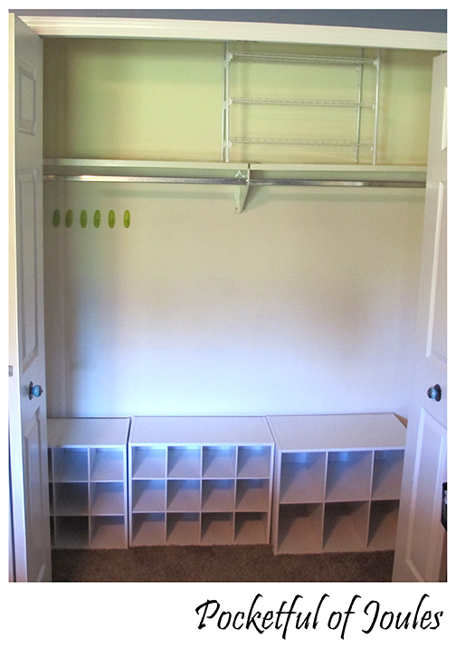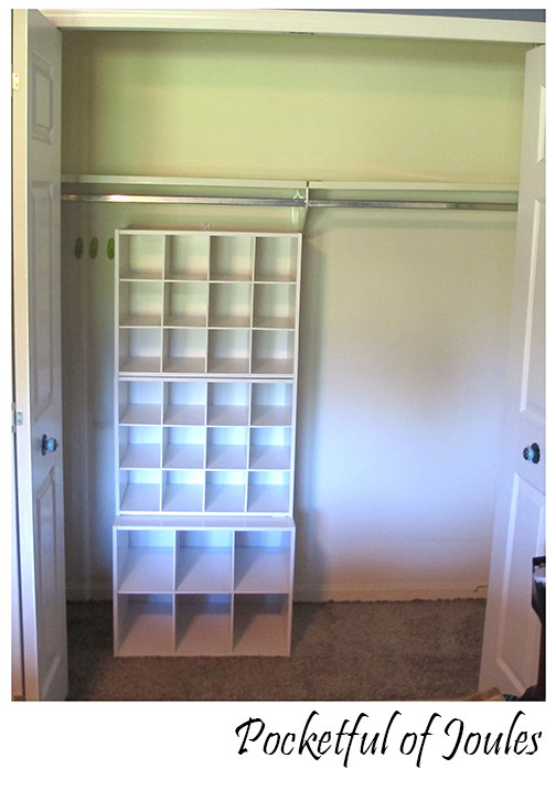 It was dangerous as heck though – especially because Jack likes to poke around in my closet – so I secured the top two organizers to the wall with these Safety 1st Furniture Wall Straps. Luckily I had a couple left over from when I childproofed the house. The cubbies are off center because there is a bar in the middle that is just a little bit lower than the top organizer. It works though, because it divides the closet into two areas. You can’t really see it, but there is a couple feet of space to the left of the cubbies.