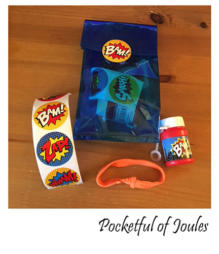 Included in each: Superhero Sayings Bracelets, Superhero Stickers, Superhero Bubbles and Blue Treat Bags.