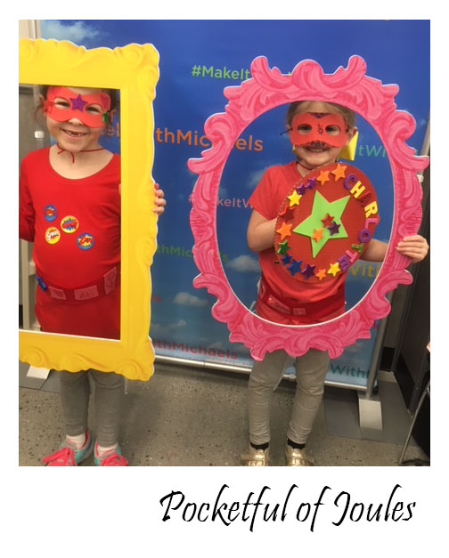 We went with a superhero theme and Michael’s provided the crafts: a superhero mask to conceal their true identities, as well as a cape, shield and belt!