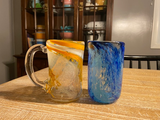 After we made our masterpieces, we left them there for a couple days so they can safely come down to room temperature. Travis brought them home one day after work and we are both flabbergasted that we actually MADE these glasses!