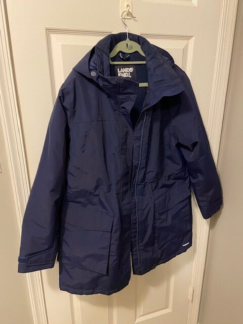 It’s the Lands End Squall Waterproof Parka in Deep Sea Navy and it retails for $199. This particular coat is from Winter 2022 (you can tell by the inside tag), it is in fantastic condition and even has adjustable elastic in the waist so you can give it a little shape if you want. It’s the size I would have preferred, a color I enjoy and the exact cut that I was hoping for.