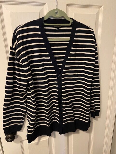 Now that it’s chilly outside, my store has a ton of sweaters. Like three full rows of just cardigans. So, it’s a bit annoying that they have all started creeping up in price. This Talbots cardigan seems to be very well made with no pilling or issues, so I didn’t really mind paying $9 for it. I’m currently without a striped cardigan, so this one will fill a hole in my closet.