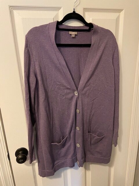 Speaking of cardigans, I also found this pretty lilac one from J.Jill. It’s classic in its shape, but a bit longer than currently fashionable. Or, is it about to be in fashion again? I don’t know. I just know I like it, and I don’t have any similar colored cardigans. I basically throw these on over t-shirts most of the year, so when I find a nice one, I wear it until I wear it out.