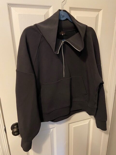 I’m pretty sure this is the CALIA soft scuba ¼ zip pullover from Dicks Sporting Goods (retail $88). It’s super cozy and still for sale online. I like that it’s kind of ‘less casual’ kind of material with a funnel neck (rather than a hood), so you get all the comfort of a hoodie, but it looks a little more elevated on Teams calls. It’s also a bit boxy and cropped, so it looks really cute with joggers and leggings. I immediately washed this and have already worn it a half dozen times. It’s fabulous!