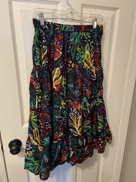 I’m a big believer in ignoring size tags and this skirt proves that is a good idea because it’s tagged as a Small Petite. But it fits my not small, not petite body just fine! It’s a 100% cotton vintage skirt and exactly the kind of skirt I love to pair with a tank top or graphic tee shirt over the summer. Love it!
