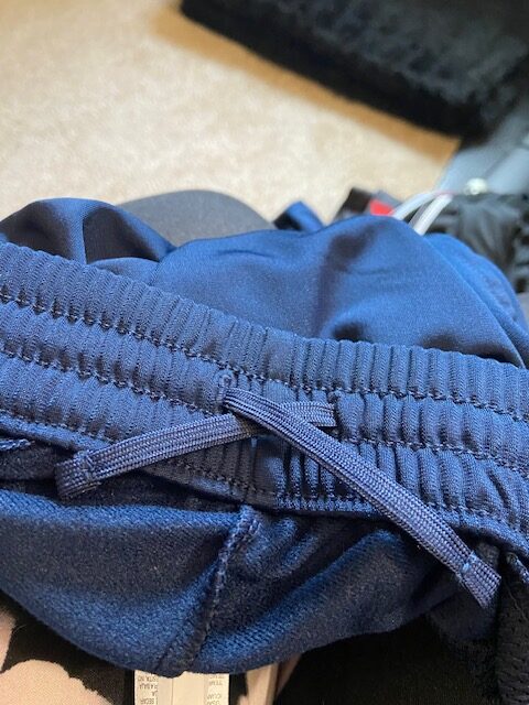 The joggers have elastic in the waist and a drawstring, but they are still way too big on my kiddo. Sure, we can tie the drawstring as tight as possible, but then he can’t push them down and up for the bathroom. And when he tries to tie them on himself, he just can’t get them tight enough that they stay around his waist (and don’t fall around his ankles). Because this is a problem that every preteen wants when he is going to middle school. Obviously.