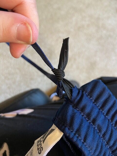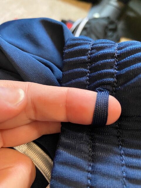 Step 3: Pull the drawstring OUT of the pants, which threads the elastic through in its place.