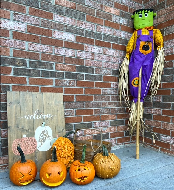 We picked up some ACTUAL pumpkins too and decided that each one of us would get to carve one. My husband carved the squinty laughing face, mine has ‘heart eyes’ and Jack’s is the toothy guy with a door in the side of his head. I also grabbed a couple warty pumpkins to add to the front porch for some extra fun.