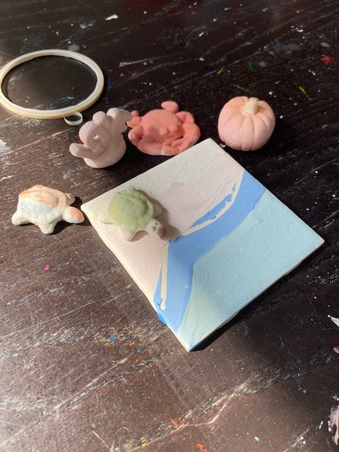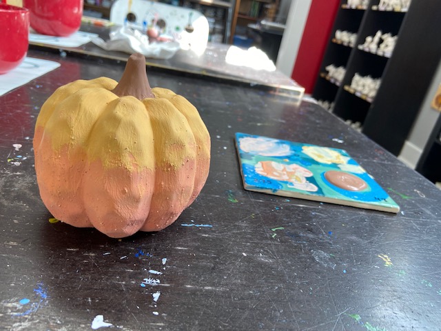 My coworker gave me a gift card for a local pottery painting place that I had never visited, so I was happy to try somewhere new. Jack was excited because he LOVES anything artistic! He picked out a few different small items to paint and I chose a pumpkin for myself. For this one, I did an ombre look with a lighter orange at the top, a medium speckled orange in the middle and a dark orange at the bottom. They are going into the kiln on Friday and we should be able to pick them up this weekend, so I can’t wait to see how they turn out!