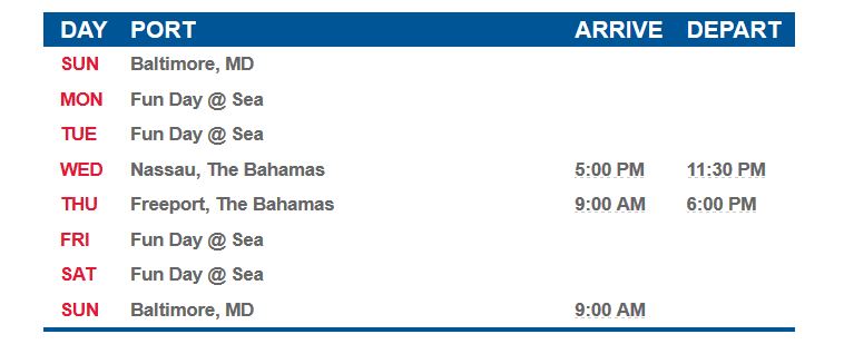 We were scheduled to board the Carnival Pride out of Baltimore around noon on Sunday for a leisurely 7 night cruise down to the Bahamas and back. Our itinerary included 2 days at sea, full day’s at Grand Turk, Half Moon Cay and Freeport, then 1 more day at sea to come home.