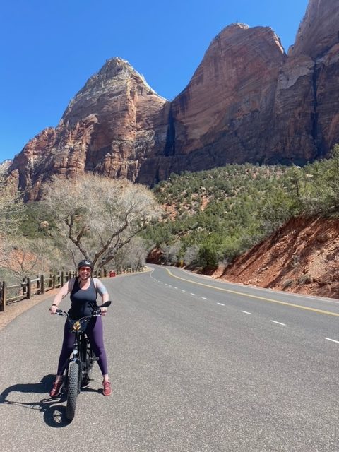 Next stop was Zion National Park — we used our America the Beautiful annual pass here too. We had so much fun riding e-bikes in Austin (you can read about it here), that we decided it would be a great way to enjoy the sights of Zion. However, when we arrived by driving through the mountains, Travis said that even if he didn’t get out of the car the trip would have been worth it. THAT is how mind-blowing the sights are here!