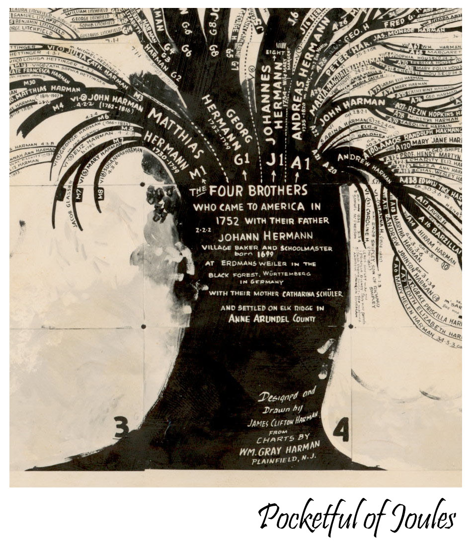 The trunk of the tree starts with Johann Hermann, a village baker and schoolmaster born in Germany in 1699, branches off for his four sons who came to America in 1752, branches off more and more and more and more… all the way to me!