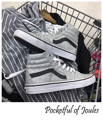 Yeah, they pretty much HAD me at glitter and high tops… the $7 price tag was just the cherry on top. I love fun shoes and these silver glitter Vans are perfect for me. Depending on the brand/style, I wear anywhere from an 8 to a 9… so I was bummed when I saw that these were a 7.5 I tried them on though and even with my warmer socks on they didn’t feel too tight. I figured I’d give them a try and googled some tips on how to stretch sneakers. Only the left one was a bit tight in the toe-box area, so I tried the ‘put four socks on your foot and shove it in there’ method.