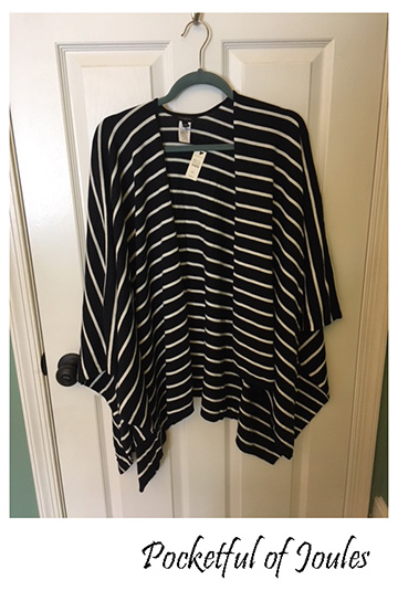 I was looking in the cardigans section for a striped sweater to replace one of my favorites that is starting to look kinda sad. I saw this striped cape and it is a brand-new with $89.50 tags still on it from Talbots. I wear my Causebox cape all the time and this will be a perfect spring option. You can see a dressing room pic of this cape and the next dress here (click the little arrow).