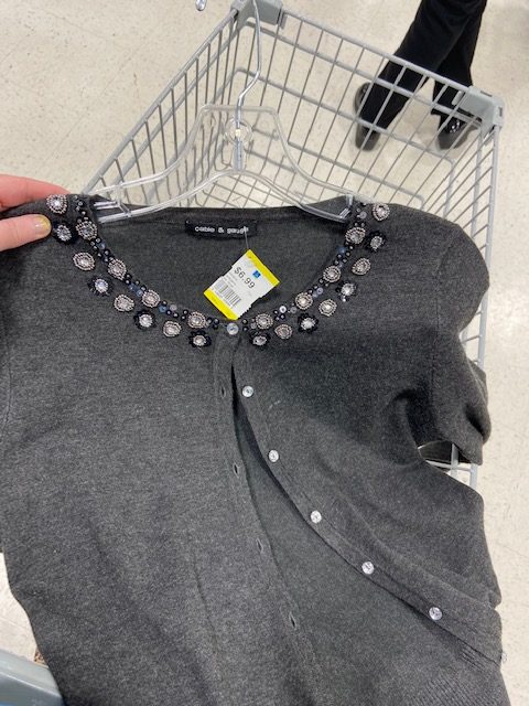 While running errands one day, I stopped by a thrift store that I’ve found many fun items at previously. Although I took a bunch of stuff into the dressing room, only this beaded sweater came home with me. I love Cable & Gauge sweaters and probably have thrifted over a half-dozen with two of them having beading. This one is a perfect shade of gray with a bit of sparkle around the neck and on the buttons. I’ve already worn this one twice and it’s a great addition to my wardrobe.