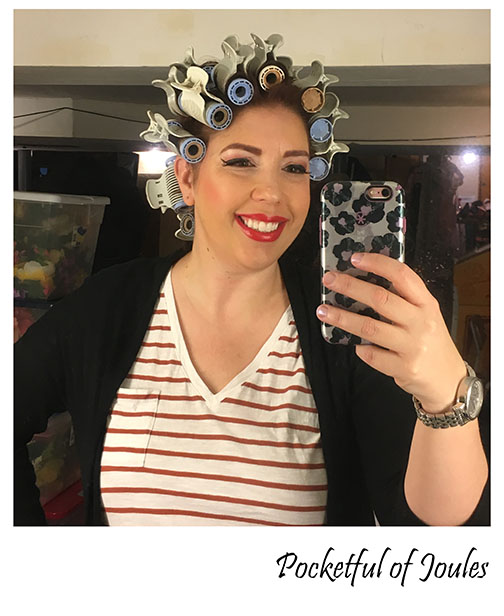 Stacy from Atomic Cheesecake started by putting my hair up in curlers, airbrushing foundation on and then slapping on a crap-ton of makeup.