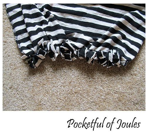 To tie the fringe, I flipped the shirt inside out and then started at one side and just tied each pair of strips (one from the front and one from the back) into a knot. Then, I moved onto the next two strips. When I got to the end, I just flipped it around and tied each coupled knot to the one next to it. It sounds harder than it was.