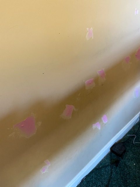 First step was to spackle all the holes. I like the kind that goes on pink and then fades to white once it’s completely dry. I let that dry overnight and then gave it a nice smooth sanding the following morning.