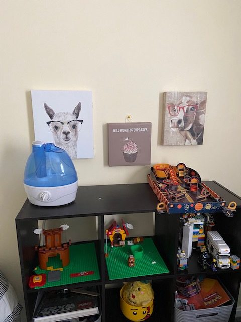 The little yellow locker nightstand actually has a working lock, which was super thrilling for my treasure-hunter kiddo. The silly animals in glasses canvases were relocated to over the toy organizer. And the fluffy rug feels fantastic on your toes and brings in some more fun patterns!