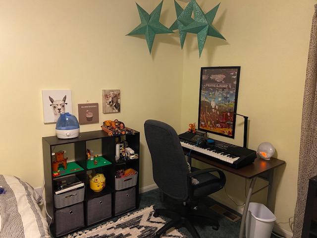 There was wasted space next to Jack’s bed, because there was a heat vent on the floor that we didn’t want to block. There were a surprising amount of holes and dents in the walls from stuff that had been moved around over the years. Drywall anchors make quite a big hole when you yank them back out! Also, lots of just random marks from markers and pencils and whatever else happened in there when I wasn’t looking.