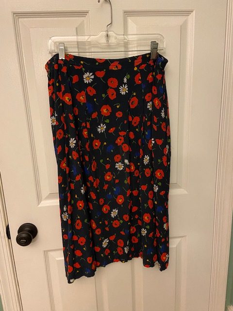I did so much googling on the brand, and as much as I can tell it is a German brand vintage skirt. I love the fabric and the print is super cute — to me it feels very ‘Kate Spade’ with the floral. For just $3, I couldn’t pass up this fun midi-skirt and it will be great for work with a wrap top, or paired with a blouse and cardigan. I wore it to work last week and you can see it in action here with a simple wrap top and bright sandals!